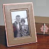Photo frame 4"x6" in size for picture With a stand on the frame back MDF structure, wrapped in pvc leather Main color in muddy-brown and pink color as an inlay to show the contrast Unique design